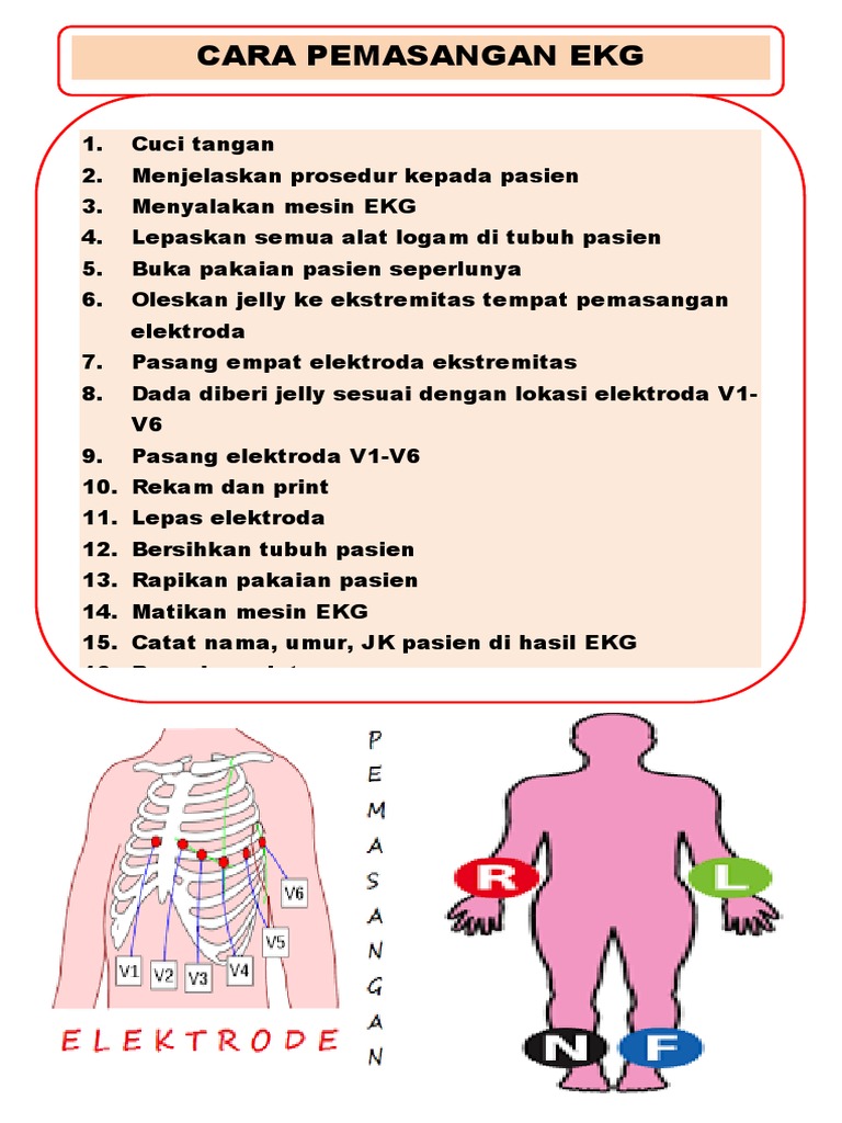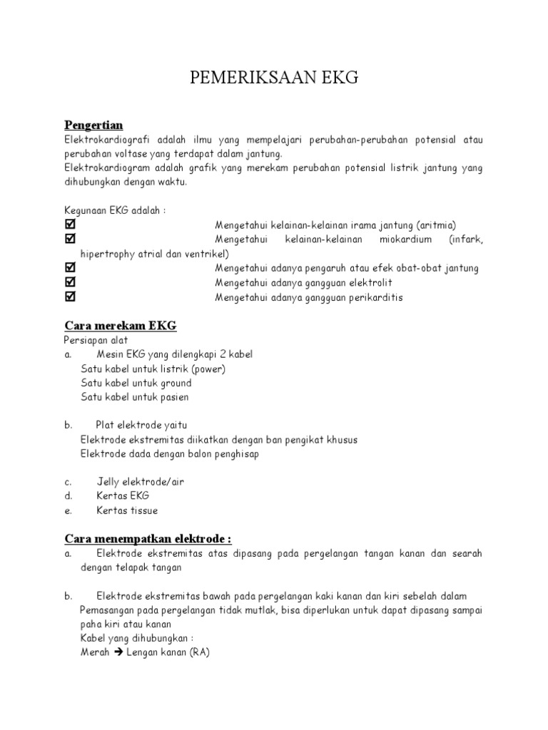Artikel di bawah ini akan menjelaskan tata cara memasang ekg yang benar sesuai standar. Suatu elektrokardiogram ekg atau ecg adalah suatu pemeriksaan yang merekam aktivitas elektrik di dalam jantung anda. Elektrokardiogram ekg adalah grafik yang dibuat oleh sebuah elektrokardiograf yang merekam aktivitas kelistrikan jantung dalam waktu tertentu.